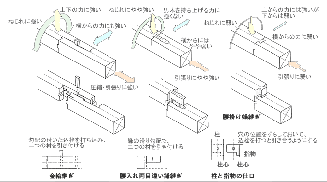 しかし、木材の規格化と機械加工では長い材料を使うことができない場合もあります。そのような場合にはこれらの継手を力のかかる所に使い分けることが大切です。